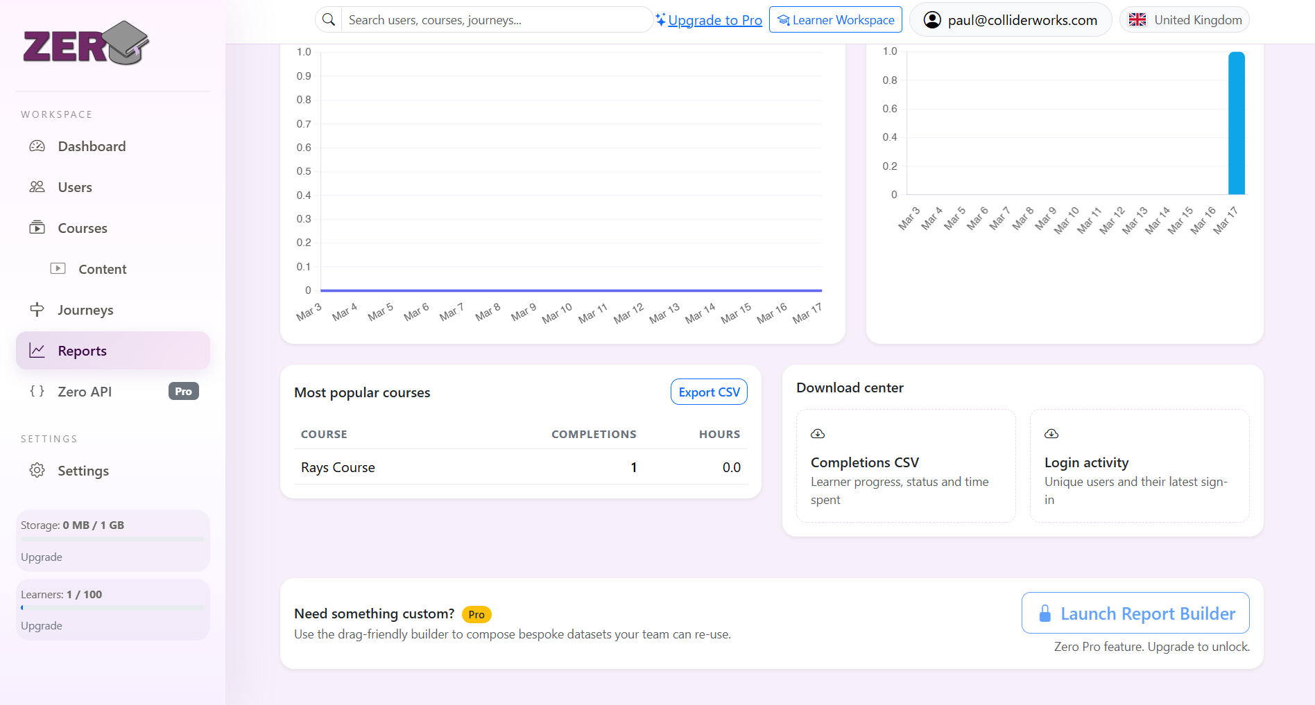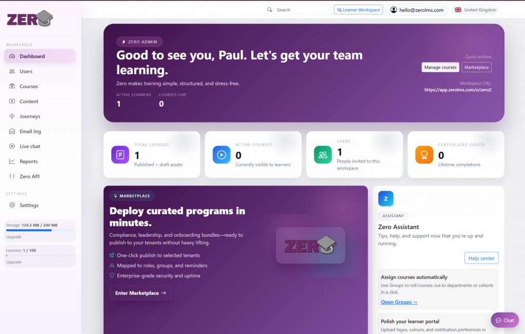 Unlike traditional systems that charge you for every new hire, Zero LMS is totally free up to 100 users and then only £149p/m for ZeroPro which increases this to 500 along with many more benefits. This fixed cost approach allows you to scale your team without a surprise bill at the end of the month.